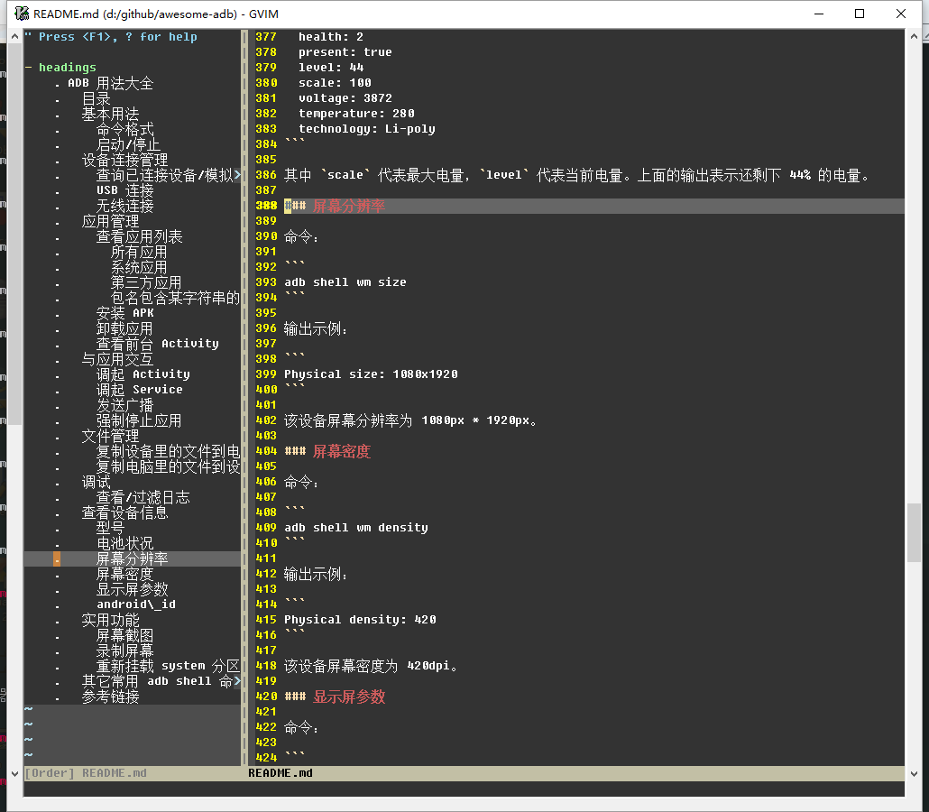 C:\Users\<username>\.ctags.d\markdown.ctags),将如下内容贴到文件里:--langdef=markdown --langmap=markdown:.md --regex-markdown=/^#{1}[ \t]*([^#]+.*)/. \1/h,headings/ --regex-markdown=/^#{2}[ \t]*([^#]+.*)/. \1/h,headings/ --regex-markdown=/^#{3}[ \t]*([^#]+.*)/. \1/h,headings/ --regex-markdown=/^#{4}[ \t]*([^#]+.*)/. \1/h,headings/ --regex-markdown=/^#{5}[ \t]*([^#]+.*)/. \1/h,headings/ --regex-markdown=/^#{6}[ \t]*([^#]+.*)/. \1/h,headings/这表示提取 Markdown 文件里的一到六级标题,并使用空格缩进表示层次。