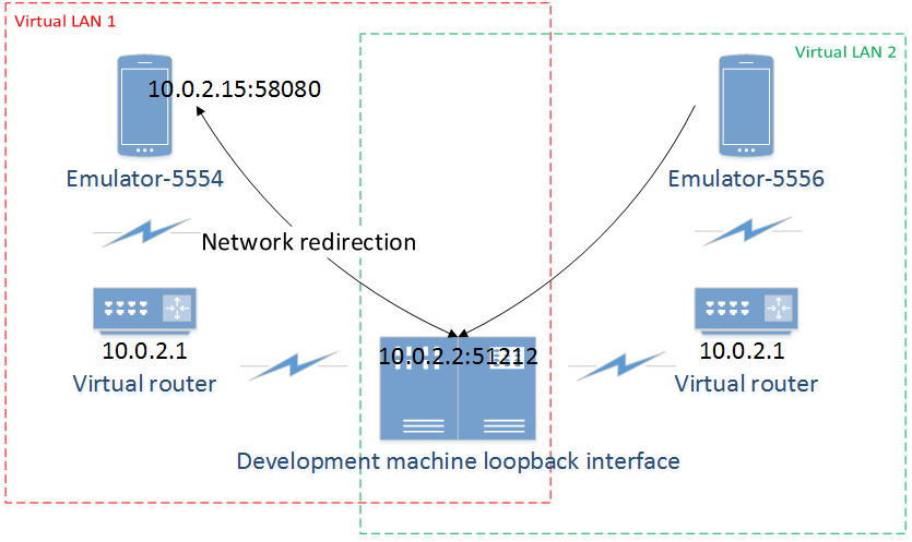 每个模拟器都运行在一个虚拟路由/防火墙服务后面,这个服务将模拟器和宿主机器的网络接口、配置以及 Internet 隔离开来。对模拟器而言,宿主机器和其它模拟器对它是不可见的,它只知道自己是通过以太网连接到路由/防火墙。