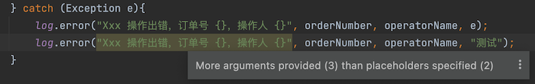 log.error("Xxx 操作出错,订单号 {},操作人 {}", orderNumber, operatorName, e);