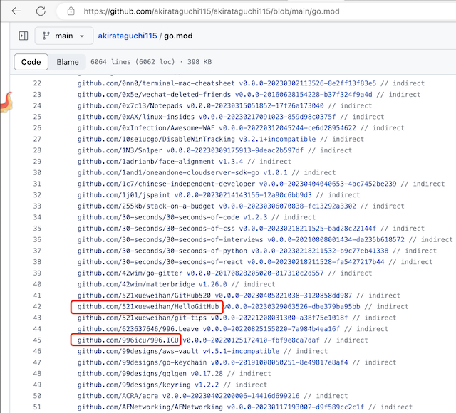 它们的共同点是在项目里有一个巨大的 go.mod 文件(初步判断出自 akirataguchi115 之手),里面列出了大量的依赖,足足有六千多行,但实际上都是没有用到的。里面列举的托管在 GitHub 上的「依赖」项目,我随便扫了一眼,有一些熟悉的名字,比如 HelloGitHub、996.ICU 等都赫然在列,甚至还包括了我的 awesome-adb,随机打开几个链接看了下,都是 Star 数量 5K+ 的热门项目,而且基本上都不是 package 类项目,不可能被作为依赖包。