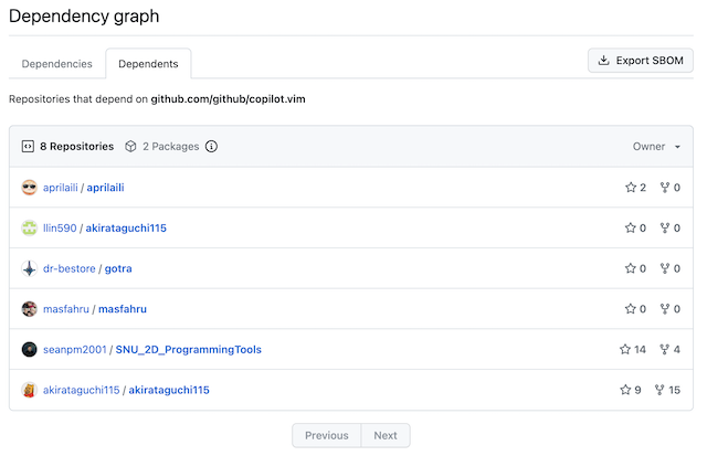 具体怎么回事呢?我上周在 Vim 插件大佬 tpope 的一个项目提了个 Issue,但一周过去了,大佬也没有回应,我就去他的 GitHub 主页确认他这一周有没有活动记录,看到他最近的提交活动是给 github/copilot.vim 项目——这是 GitHub Copilot 的官方 Vim 插件项目,我也在用,心想这也太巧了吧,于是点进项目主页看了一眼,大佬果然是大佬,竟然是这个插件的主要维护者,不由心生赞叹,同时在 Contributors 列表的上方我还发现了一个以前没太注意到的信息,「Used by」: