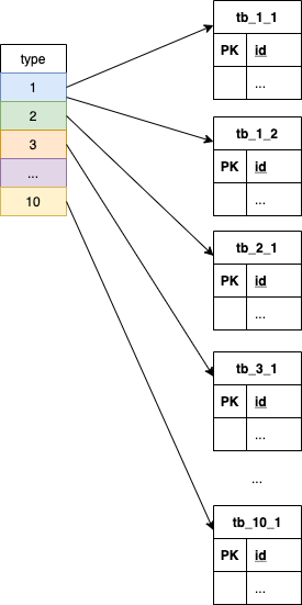 业务主键可能的取值较多,千万量级,type 取值范围为 1-10,可以任意组合,每种 type 对应到数据库是 1-N 张表,示意: