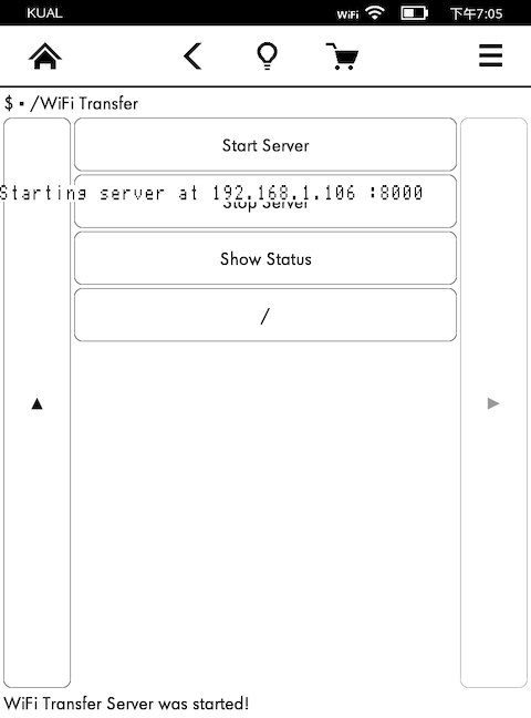 在 Kindle 上打开 KUAL,就可以在插件列表里看到「WiFi Transfer」菜单项了,点击「Start Server」,Kindle 上将显示