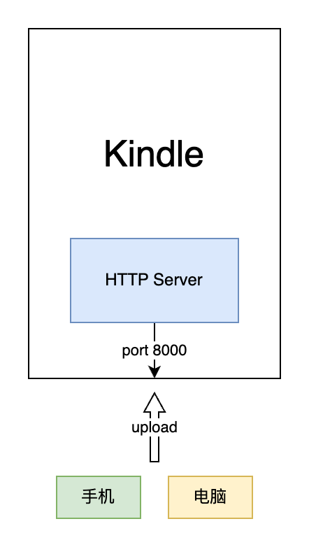 这个插件的原理是,在 Kindle 上运行一个 HTTP Server,在 8000 端口提供服务,这样局域网内的电脑、手机等设备访问 http://{Kindle 的局域网 IP}:8000,就可以打开一个能上传电子书到 Kindle 的网页。