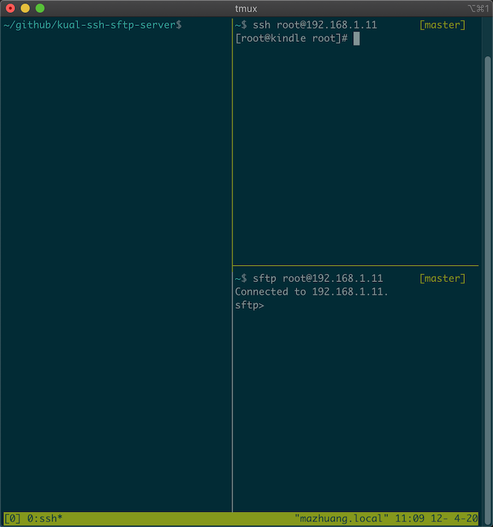 在我开始在 Kindle 上使用 KOReader 后,发现 KOReader 有一个 SSH server 的功能,开启后就可以通过 SSH & SFTP 连接到 Kindle 了,可以解决上面两个问题。不过它有一点不方便的地方,就是必须得先进入 KOReader,然后才能在菜单里开启这个功能,对于老设备来说,这几步操作可能需要耗时挺久,不能忍……