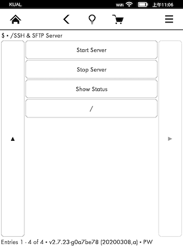 作为一个能自己动手绝不吵吵的爱折腾的程序员,我就想着,能不能在 KUAL 里加两个按钮,点击后就能开启/关闭 SSH server?于是就制作了下面这款插件: