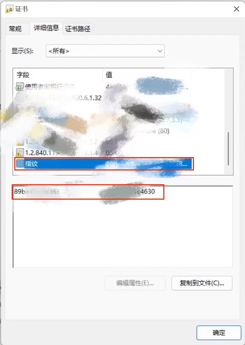 - 将 test.cer 文件传送到一台 Windows 电脑,双击打开,切到详细信息标签,分别点击上面的公钥、指纹,下方显示的字段值就是我们需要的,用 Ctrl-A、Ctrl-C、Ctrl-V 将它们复制出来即可。