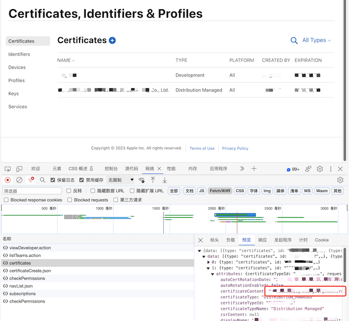 - 在证书列表页面 F12 打开浏览器开发者工具,刷新页面,在网络标签中找到 certificates 这次请求,在响应内容的 data 数组里找到需要的那个证书的 attribites.certificateContent 字段,如图所求;