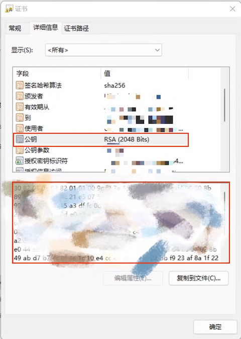 - 将 test.cer 文件传送到一台 Windows 电脑,双击打开,切到详细信息标签,分别点击上面的公钥、指纹,下方显示的字段值就是我们需要的,用 Ctrl-A、Ctrl-C、Ctrl-V 将它们复制出来即可。